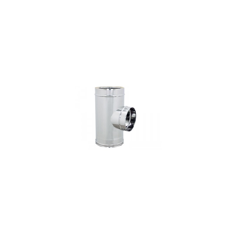 Raccordo braga a "T" con angolo di 90 gradi interna estrusa doppia parete con parete interna realizzata in acciaio inox Aisi 316L e parete esterna realizzata in acciaio inox 304BA, elemento che permette di allacciare a 90° il camino con il canale da fumo, la particolarità del raccordo retto a 90° è che è ottenuto tramite l’estrusione di un elemento lineare.